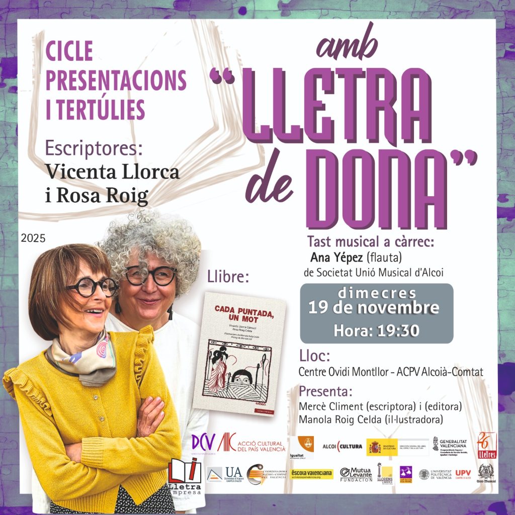 Àngels Jordà ens convida a una nova jornada del cicle de presentacions i tertúlies «Amb lletra de Dona» En Cada puntada, un mot, Vicenta Llorca i Rosa Roig teixeixen un diàleg íntim entre la memòria i la paraula. Cada text és una puntada que connecta passat i present, experiències personals i col·lectives, en un fil […]
